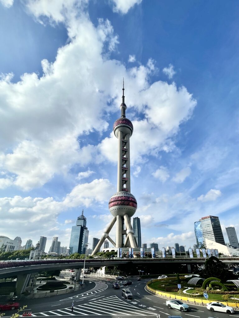 หอไข่มุก (Oriental Pearl Tower) — แม้จะถ่ายจากด้านนอก แต่บรรยากาศตอนกลางคืนคือ “ว้าว!”